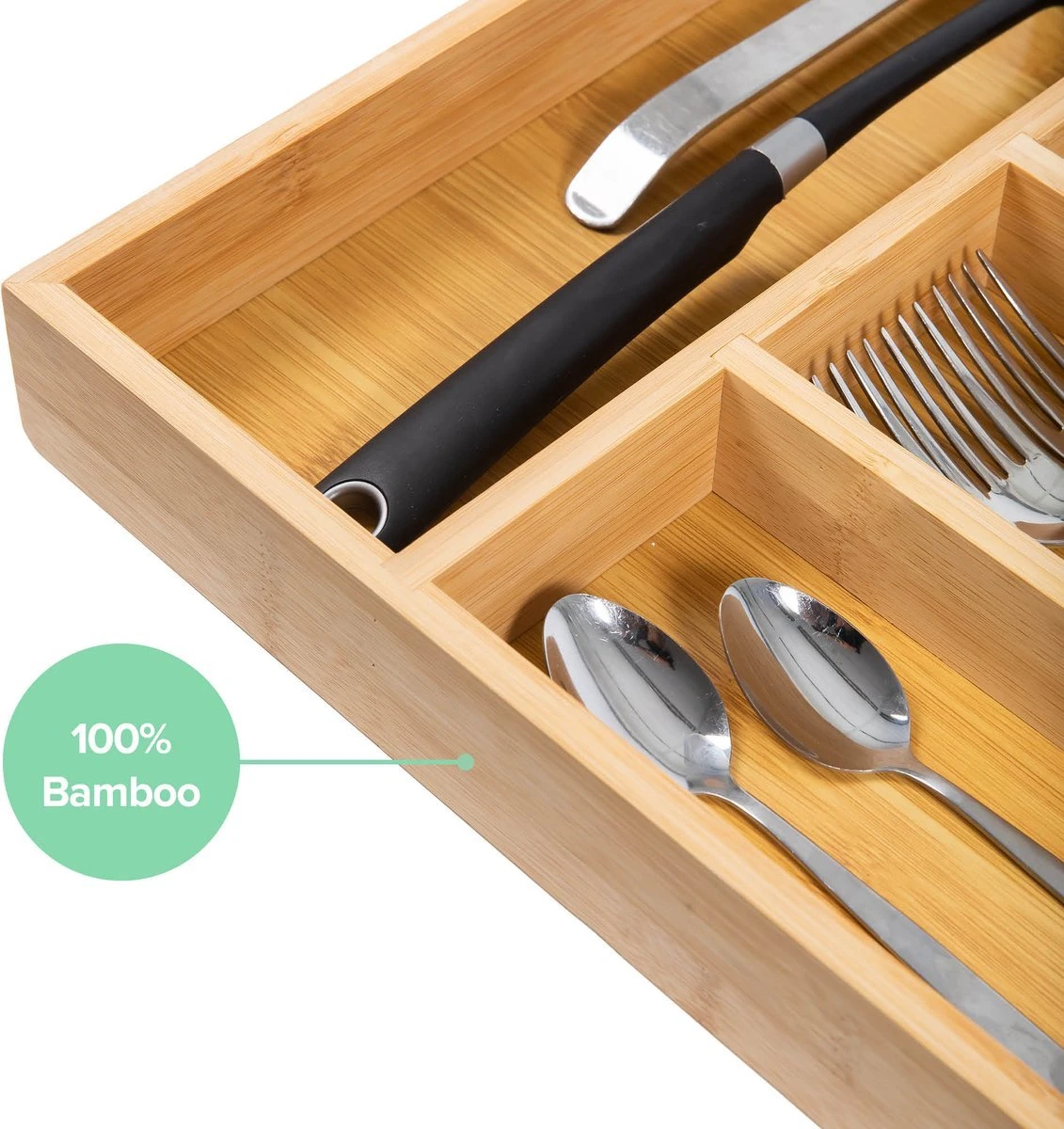 De bestekbak is zeer slijtvast door het zeer sterke bamboe hout en geeft een goede bescherming voor de voorwerpen die in de organizer geplaatst zullen worden. Bij de normale bestekbakken zal ongetwijfeld voorkomen dat de messen door het plastic heen prikken of dat de kwaliteit na enkele weken afneemt. Dit probleem heb je niet met de bamboe bestekbak.