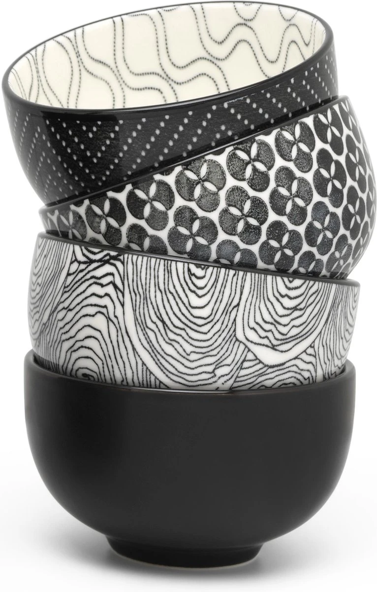 Deze set van 4 theekommen hebben een eigentijds patroon. Iedere mok is verschillend van dessin, zowel buiten- als binnenzijde. De theekommen passen bij theepot Pucheng en zijn vaatwasmachinebestendig. Wordt geleverd in een set van vier stuks.
