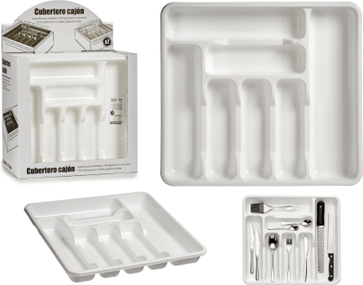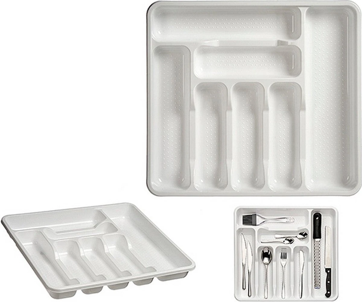 Bestekbak/bestekhouder 7-vaks wit. Formaat: 42 x 39 x 4,5 cm. Materiaal: kunststof. Keukenlade/besteklade inzetbak.