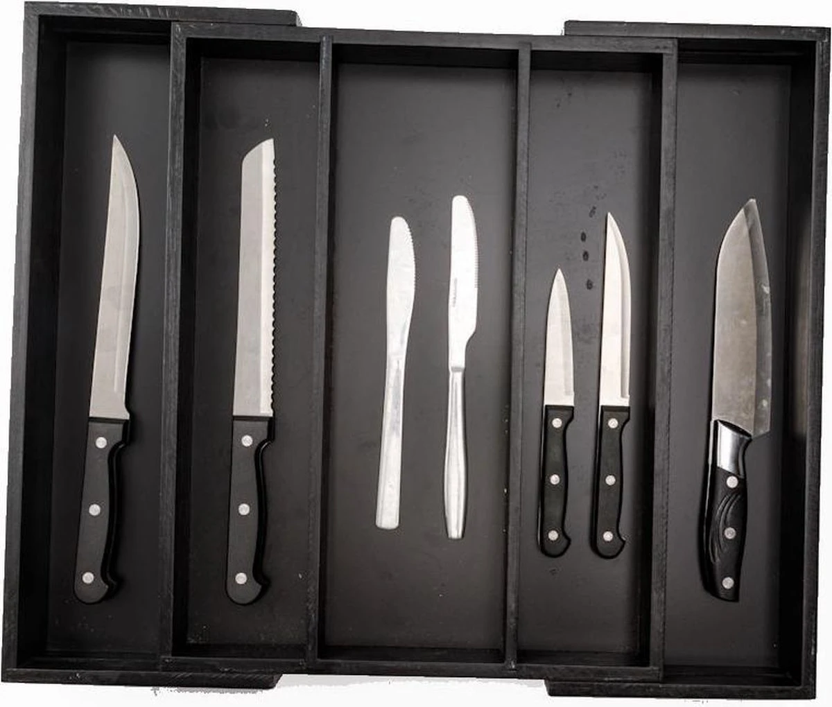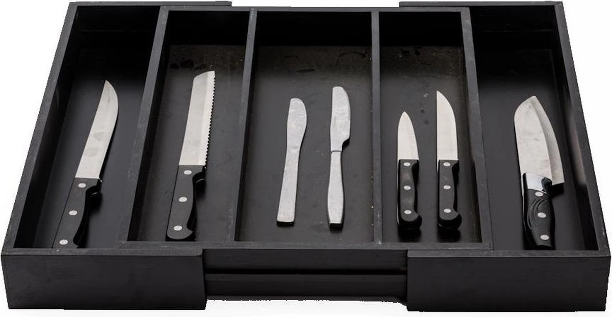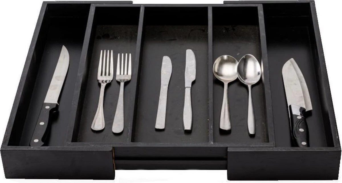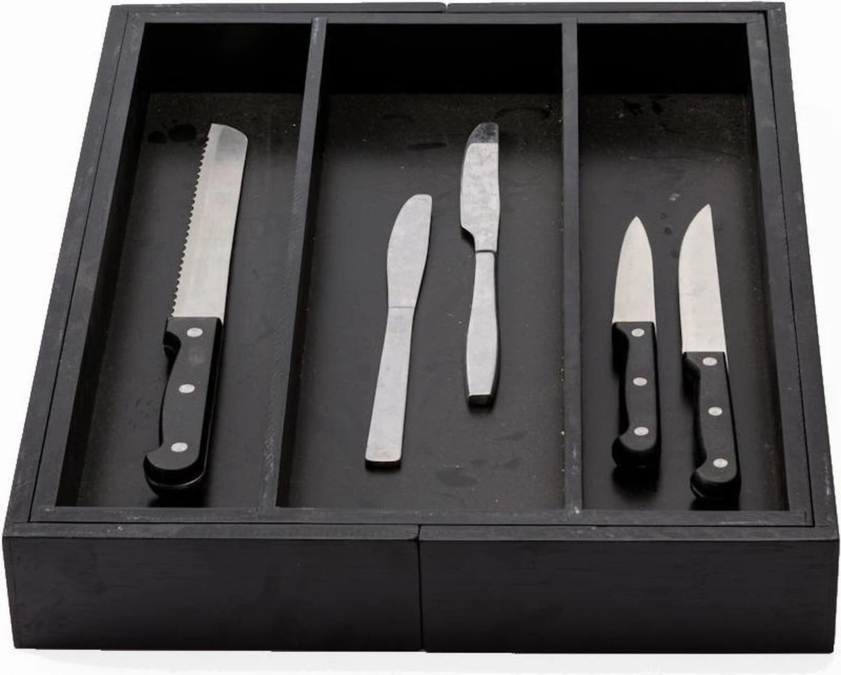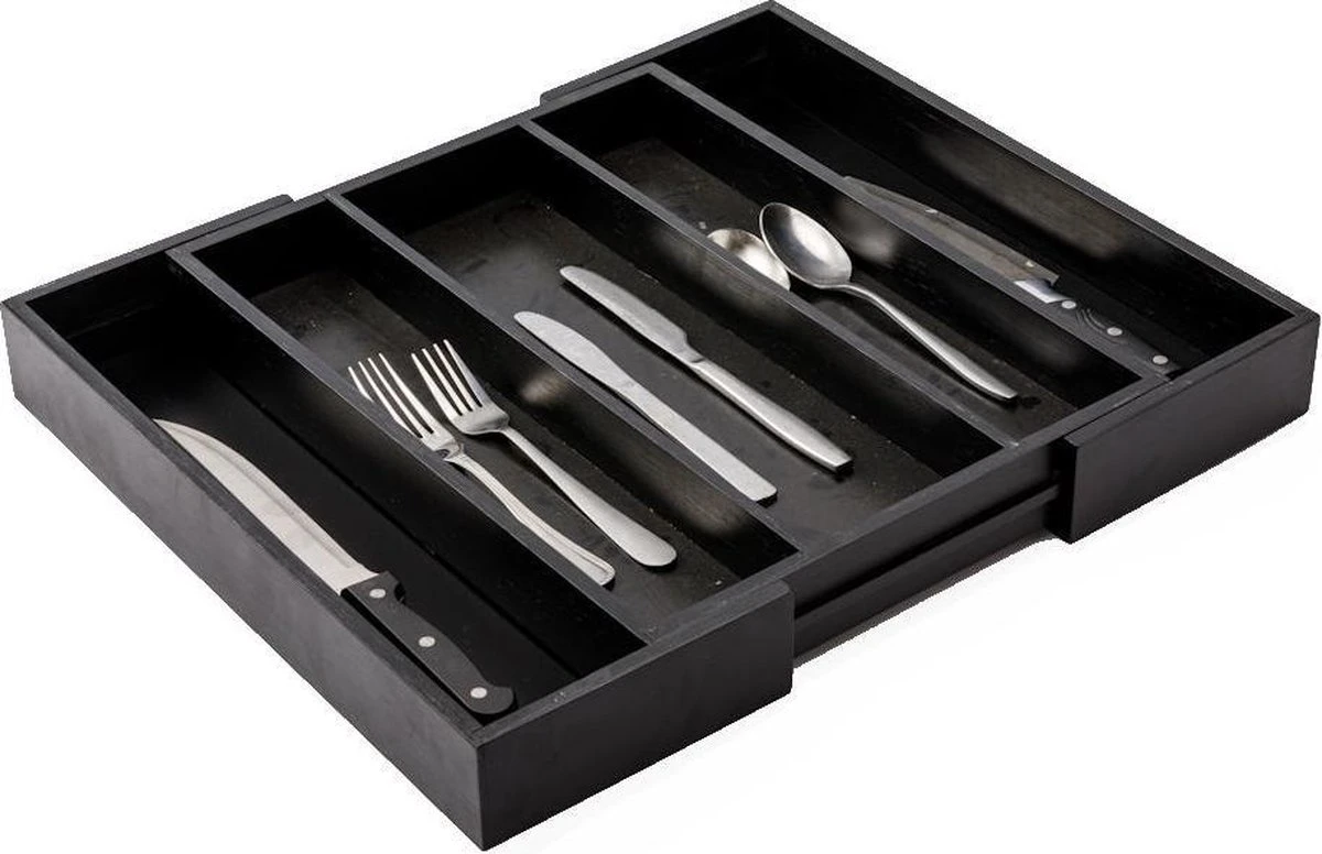 De bestekbak is eenvoudig uitschuifbaar. Zo pas je hem aan je wensen aan. Door de bestekbak uit te schuiven creëer je aan beide zijdes een vak extra. Als je de zijkanten uitschuift heb je bestekbak met 5 vakken. Genoeg ruimte voor al je bestek!