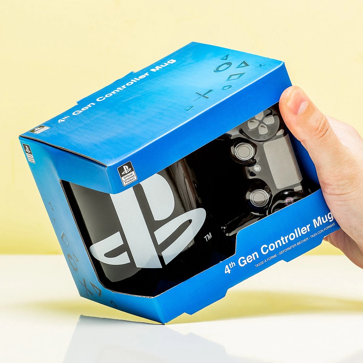 Controller 4th Gen mok van PlayStation. Beker met een oor in de vorm van een PlayStation controller van de 4e generatie. PlayStation controller mok met logo op de ene kant en de herkenbare symbolen aan de andere kant. Het oor van de beker ziet eruit als een controller. Voor fans van PlayStation 4. Niet geschikt voor vaatwasser of magnetron. Afmeting: 15 x 9 x 11 centimeter.