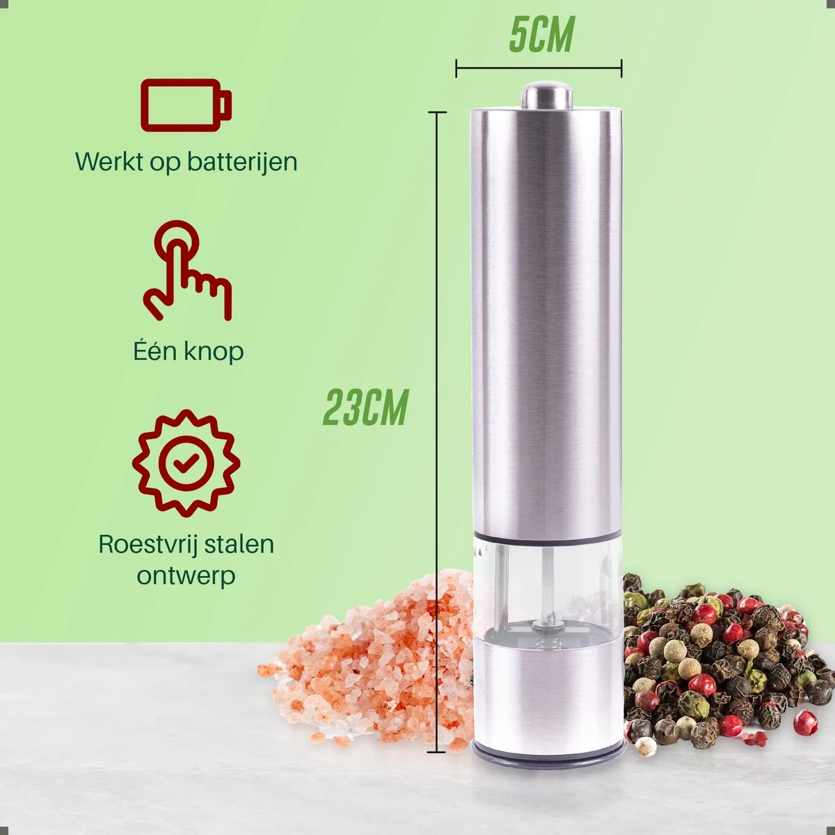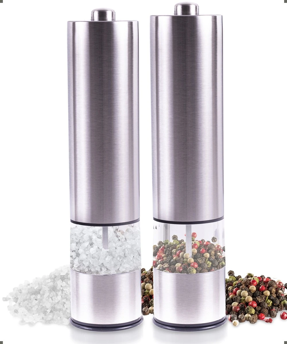 Deze elektische peper en zoutmolen met LED verlichting zorgt ervoor dat je perfect kunt doseren. Dankzij de behuizing van roestvrij staal en het ontwerp van de acrylkamer zijn de molens uiterst duurzaam en is er geen risico op glasbreuk.