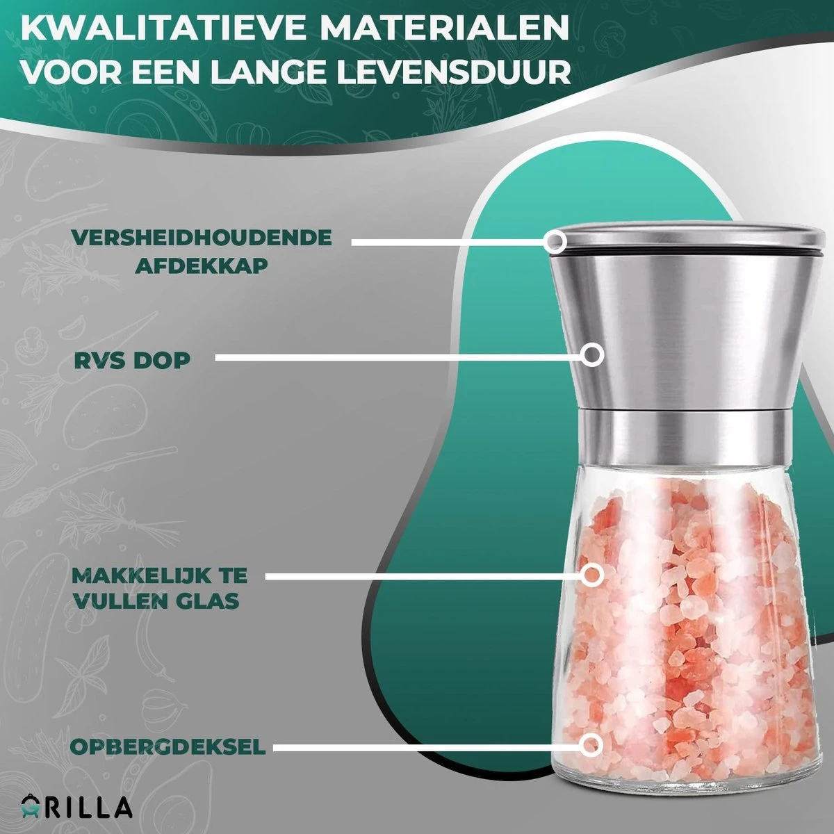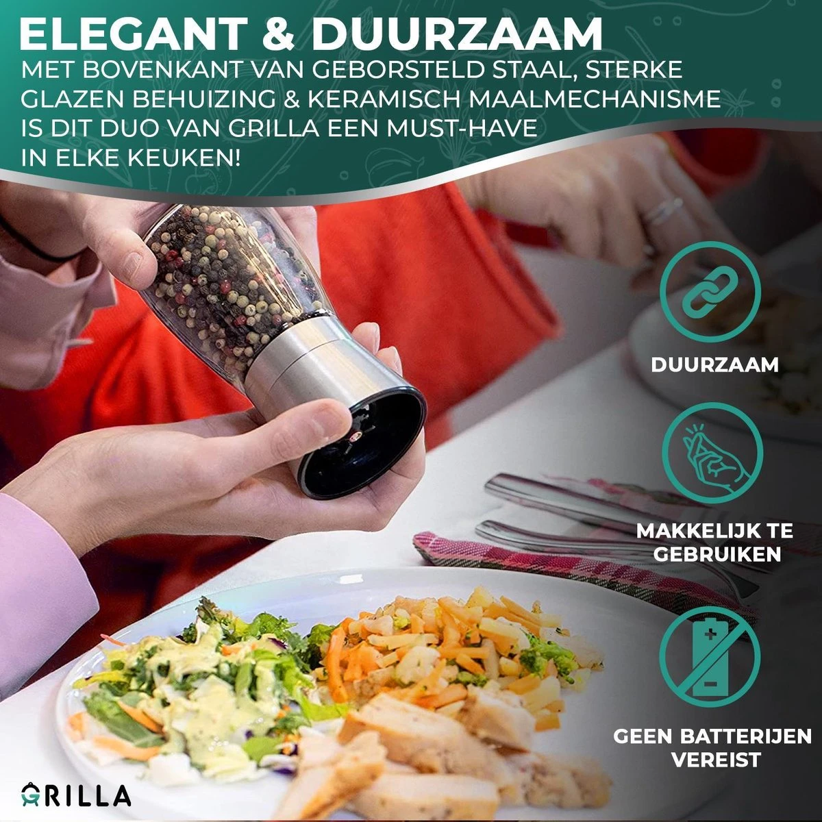 Bij Grilla hebben we al deze problemen aangepakt. Speciaal voor jou, je portemonnee en moeder natuur. Dus zeg alvast dag tegen die oude on-ecologische zout- en pepermolens!