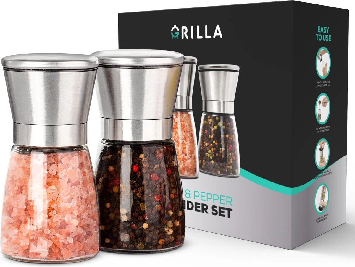 We kennen het allemaal wel, die veel te dure kleine zout- en pepermolentjes die je in de winkel kan kopen. Of die Ooo zo mooie kartonnen cilinders, die veel mensen hun kast hebben staan. Waarom staan al die zout- en peperstellen altijd in de kast denk je? Klopt, ze zijn gemaakt om weg te gooien, niet goed voor de natuur of je vrouw haar ogen, grapje… Maar zonder te dollen hebben wij de oplossing, de Zout- en Pepermolen set van Grilla. Je kan ze in een handomdraai bijvullen en uitgerust met roestvrij-staal en glas van de hoogste kwaliteit, zijn ze niet alleen goed voor de natuur, je kan ze ook eens op het aanrecht of tafel laten staan!